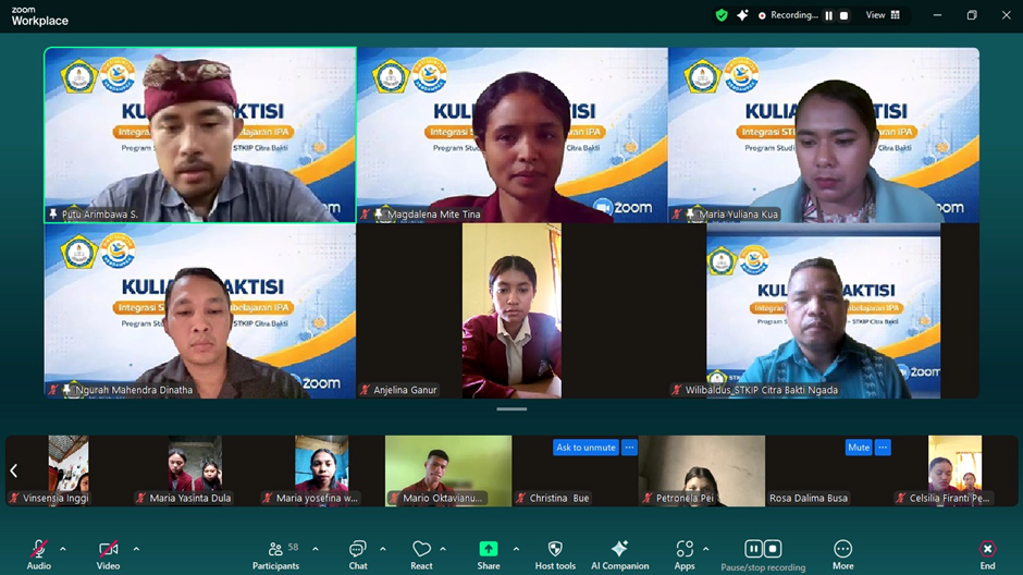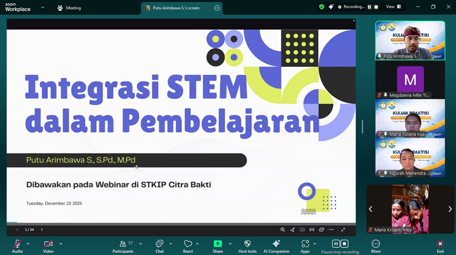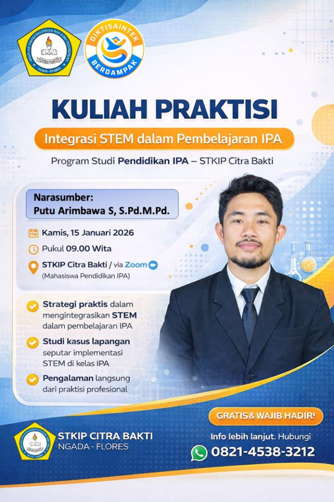 Program Studi Pendidikan IPA STKIP Citra Bakti kembali menunjukkan komitmennya dalam penguatan kompetensi calon guru melalui kegiatan kuliah praktisi bertema “Integrasi Science, Technology, Engineering, and Mathematics (STEM) dalam Pembelajaran IPA” yang dilaksanakan pada Kamis, 15 Januari 2026. Kegiatan ini berlangsung secara daring melalui Zoom mulai pukul 09.00 WITA dan diikuti oleh 65 mahasiswa serta dosen Prodi Pendidikan IPA. Kuliah praktisi ini diselenggarakan secara gratis sebagai bagian dari upaya memperluas wawasan mahasiswa terhadap praktik pembelajaran abad ke-21.