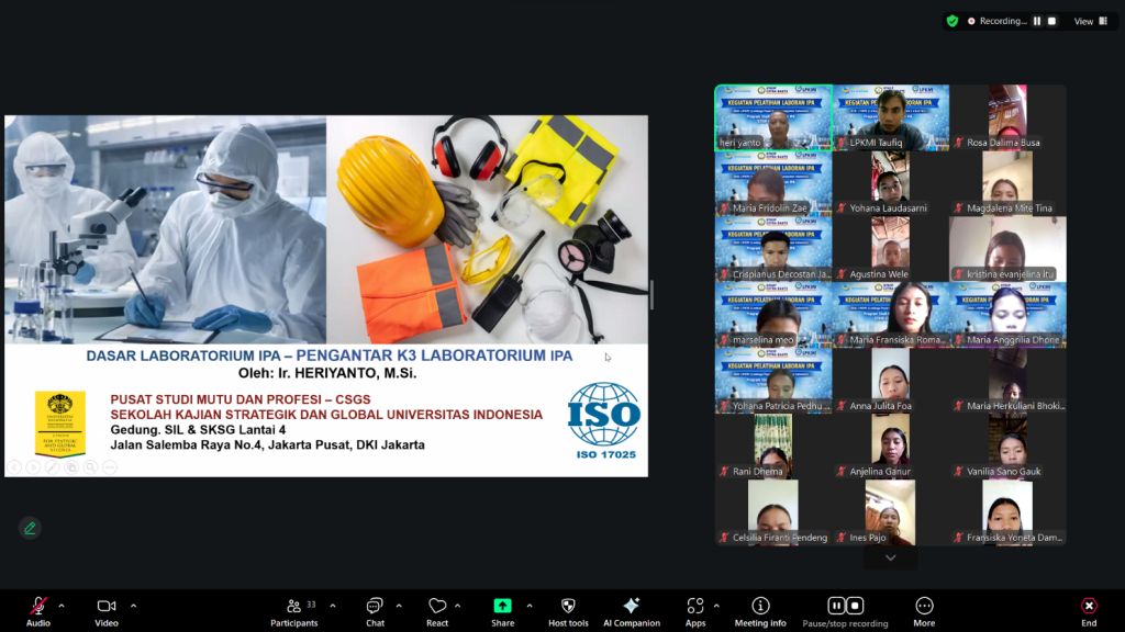 Sementara itu, narasumber menegaskan bahwa pembelajaran standar yang digunakan dalam pelatihan membuka peluang kerja yang lebih luas karena peserta diperkenalkan pada standar nasional serta praktik baik standar internasional, termasuk kerangka ISO yang relevan untuk tata kelola laboratorium pendidikan. Pada materi hari kelima, rujukan praktik baik mencantumkan ISO 9001:2015, ISO/IEC 17025:2017, ISO 45001:2018, ISO 14001:2015, serta GHS sebagai bagian dari fondasi pengendalian mutu, K3, lingkungan, dan pelabelan bahan kimia.