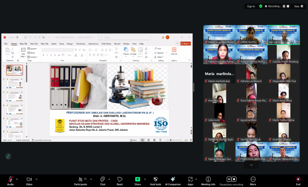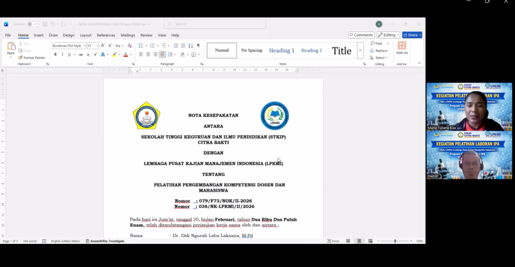 Ngada, Flores, NTT, 26 Februari 2026 – Program Studi Pendidikan Ilmu Pengetahuan Alam (IPA) STKIP Citra Bakti bersama mitra Lembaga Pusat Kajian Manajemen Indonesia (LPKMI) menyelenggarakan Pelatihan Nasional Lima Hari Laboran IPA secara daring melalui Zoom pada 16 sampai 20 Februari 2026. Kegiatan ini diikuti oleh 29 mahasiswa Prodi Pendidikan IPA dan didampingi oleh para dosen program studi Pendidikan IPA.